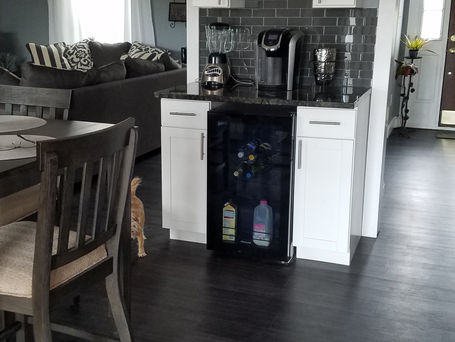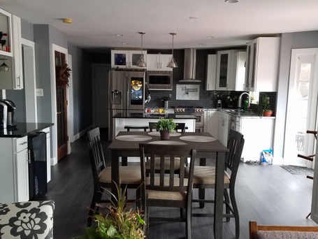 Full demo of kitchen, living room, dining room, & load bearing walls. 3D stone fireplae, with re-purposed rustic mantle. Waterproof vinyl flooring throughout first floor. Coffee bar with granite top & center block. Glass subway tile backsplash & pot filler. All new cabinets & trim. New crown molding. Open stairway with custom steel rails.